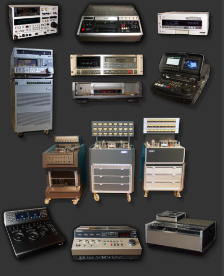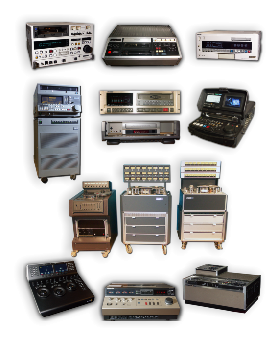 Auch „exotische“ Video- und Audioformate können wir für Sie bearbeiten. Sei es das 1 Zoll C Master aus den 80/90iger Jahren, die VHS- Kassette mit „F2“ (eine professionelle VHS Variante, die mit doppelter Geschwindigkeit lief) oder eine digitale XD-CAM Disk (vorgestellt 2004), vieles ist möglich, bitte fragen Sie uns. Hier nur eine kleine Auswahl mit Abbildungen ausgewählter Geräte aus unserem Maschinenpark. Von links oben nach rechts unten: M II Format / JVC KR-M840E, U-Matic Low Band / Pansonic NV-9240, DVCAM - Mini DV (SP) / Sony DSR-80, Sony DI Maz / DVR1000, Alesis Adat / XT20, Digital D-VHS / JVC MH-DR10000, Sony XD-CAM / PDW-R1 (SD), Otari MX5050, Lyrec TR532- 16 und 24, BMD Colour Grading Panel, Panasonic VHS-Schnitt-rekorder / NV 8500, Sony U-Matic HB / BVU 200, PCM Rekorder / Technics SV- P100, DigiBeta - BetacamSP/ Sony DVW A500